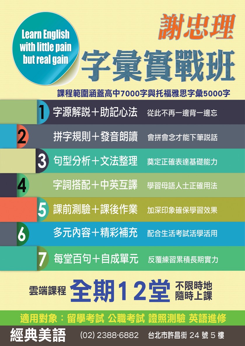 【經典美語】深知背單字之苦,以獨一無二的《字彙實戰班》整理考試真題為教材,12 堂課程涵蓋高中以上到雅思考試所需要的全部字彙,掌握雅思通關密碼,穩穩拿到 28+。